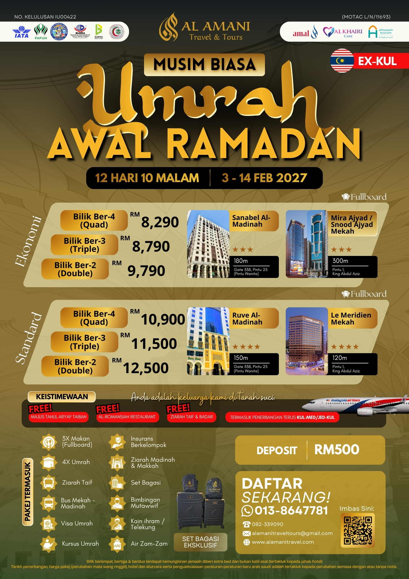 Raih kemuliaan beribadah pada fasa awal Ramadan dengan perjalanan yang lebih tenang dan tersusun bersama Al Amani Travel & Tours. Pakej ini tidak termasuk tren laju, sebaliknya memberi peluang istimewa untuk menyertai ziarah ke Badar, lokasi bersejarah berlakunya Perang Badar yang penuh pengajaran dan ibrah.