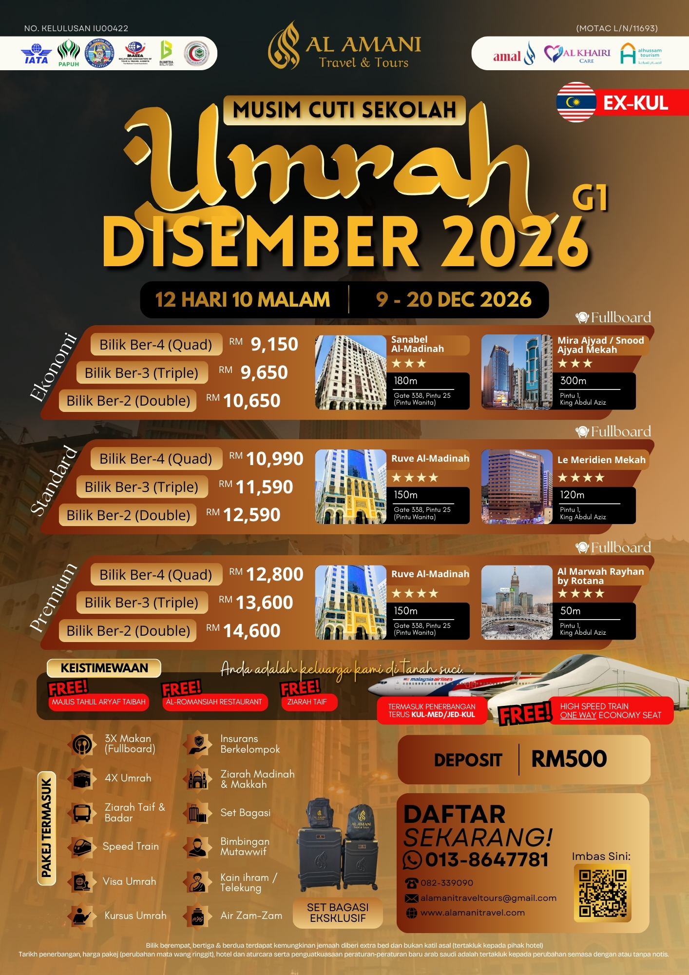 Manfaatkan musim cuti sekolah Disember dengan perjalanan Umrah yang terancang dan selesa bersama Al Amani Travel & Tours. Pakej G1 ini menggunakan laluan penerbangan KUL–MED / JED–KUL bersama Malaysia Airlines, memudahkan perjalanan terus dari Kuala Lumpur ke Madinah dan pulang dari Jeddah.