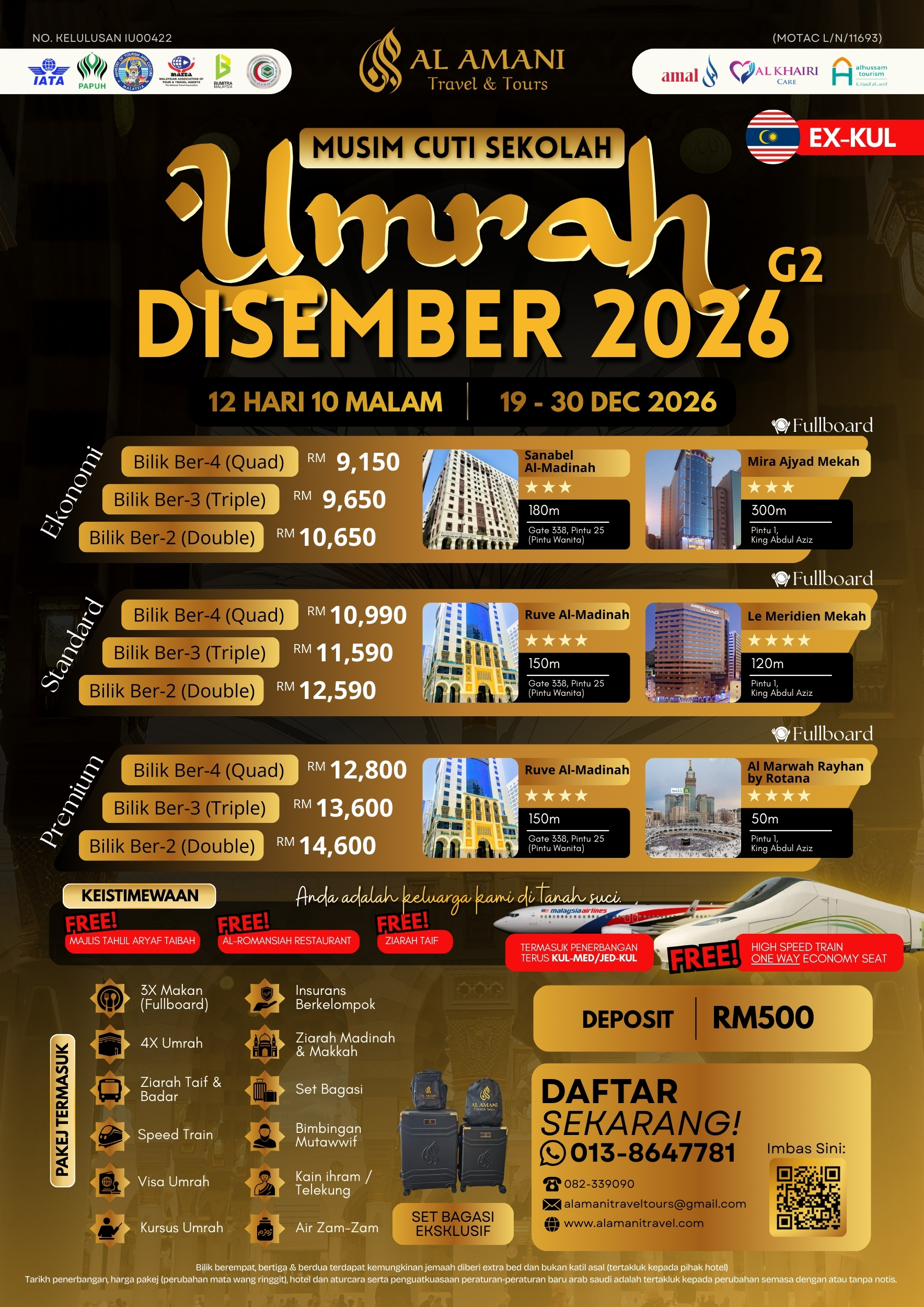 Susulan sambutan hangat G1, G2 Disember 2026 dibuka khas untuk musim cuti sekolah buat anda yang ingin berangkat bersama keluarga. Bersama Al Amani Travel & Tours, nikmati perjalanan yang tersusun dan selesa sepanjang berada di Tanah Suci.