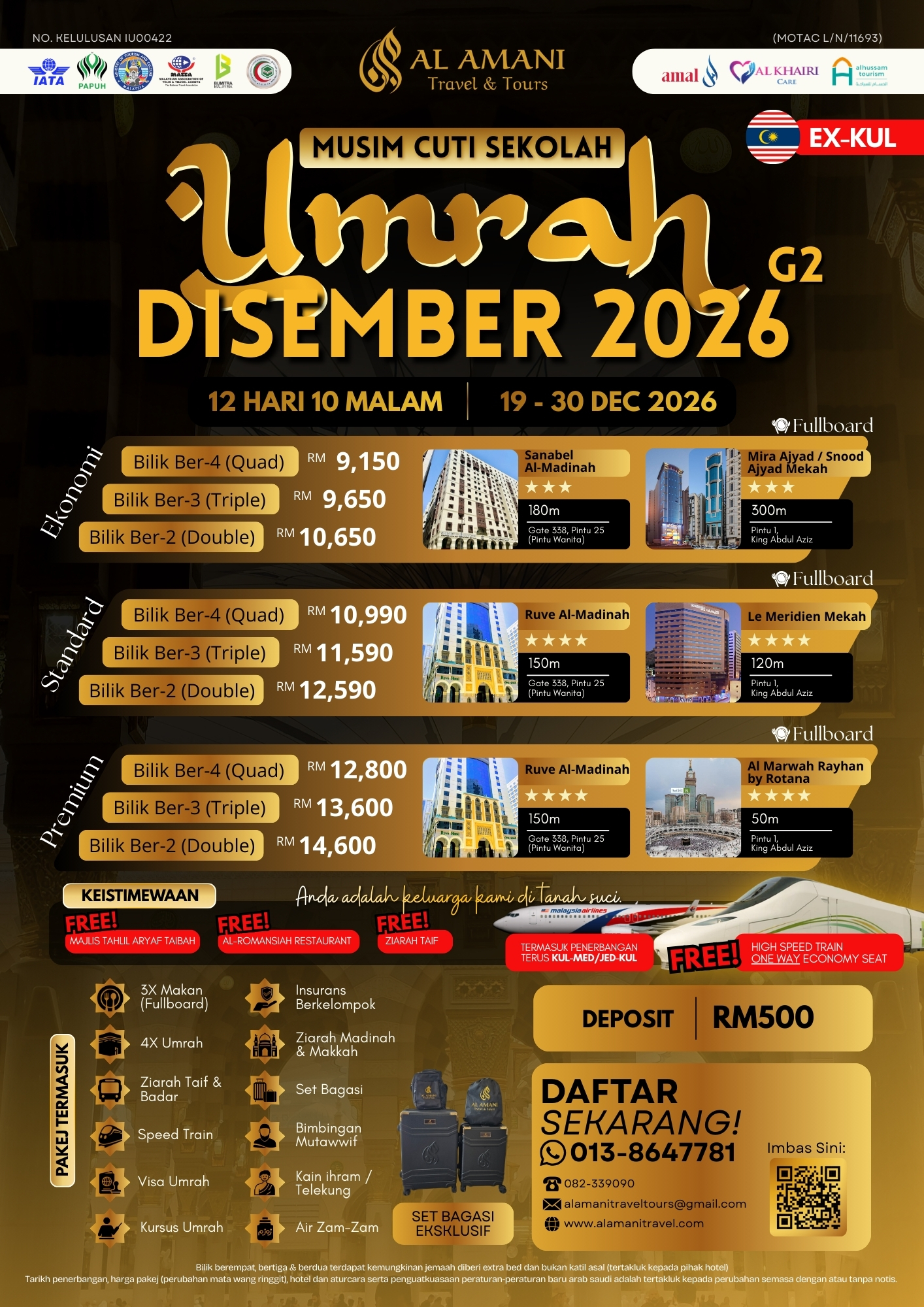Susulan sambutan hangat G1, G2 Disember 2026 dibuka khas untuk musim cuti sekolah buat anda yang ingin berangkat bersama keluarga. Bersama Al Amani Travel & Tours, nikmati perjalanan yang tersusun dan selesa sepanjang berada di Tanah Suci.