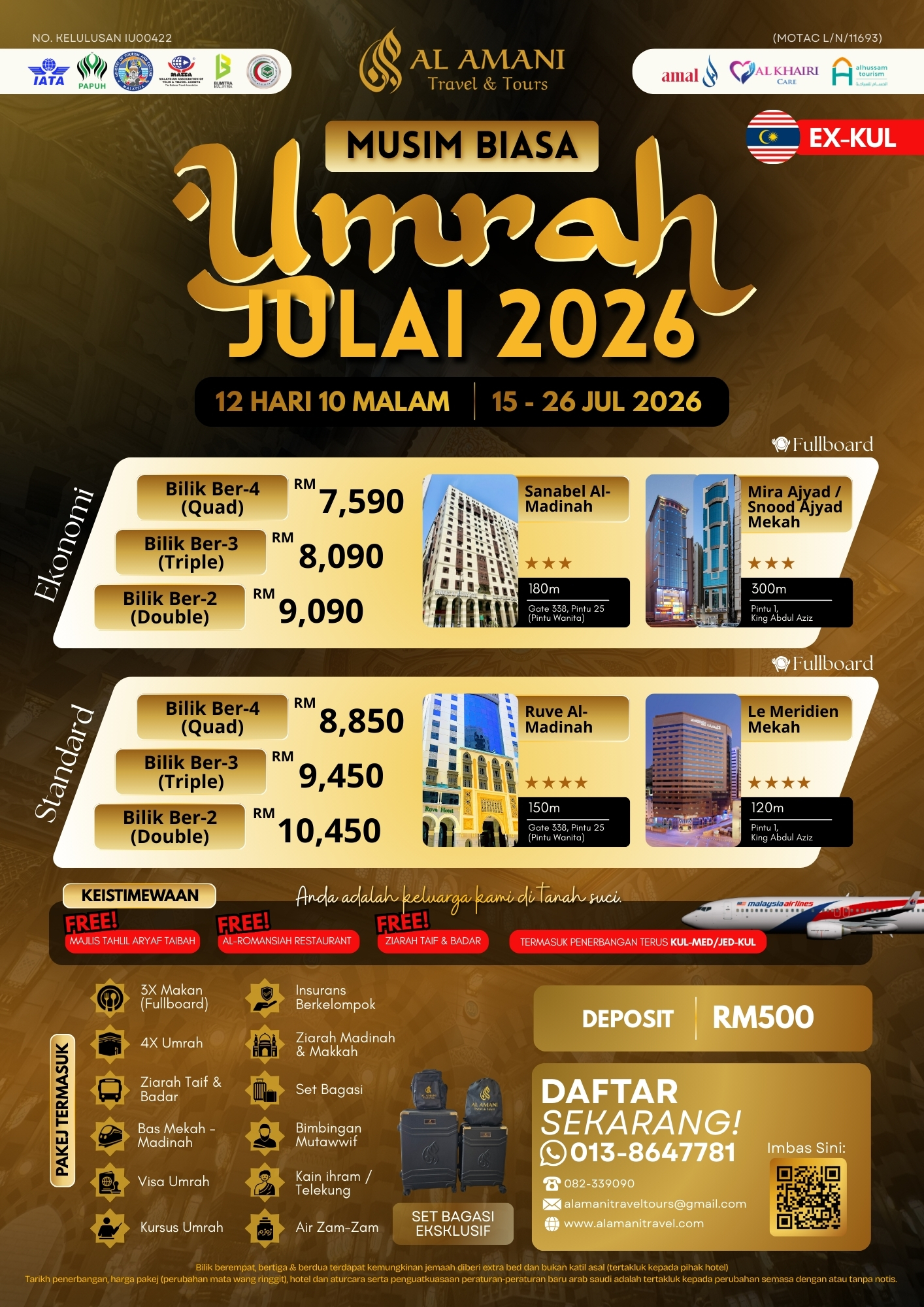 Dengan layanan mesra dan prinsip Ikhlas & Amanah, kami komited menjadikan anda sebahagian daripada keluarga kami di Tanah Suci. Jadikan Julai 2026 titik mula perjalanan rohani yang lebih bermakna bersama Al Amani.