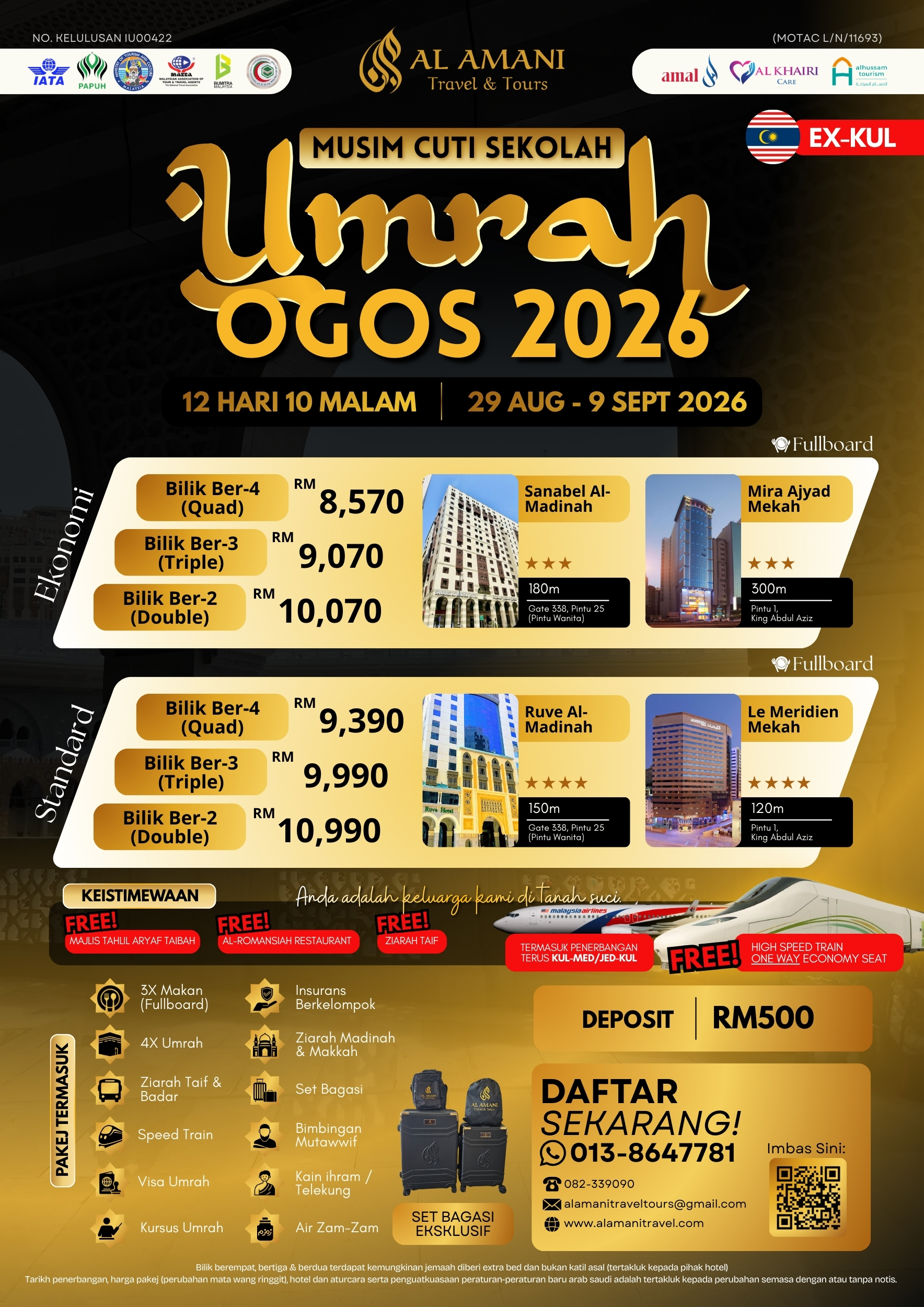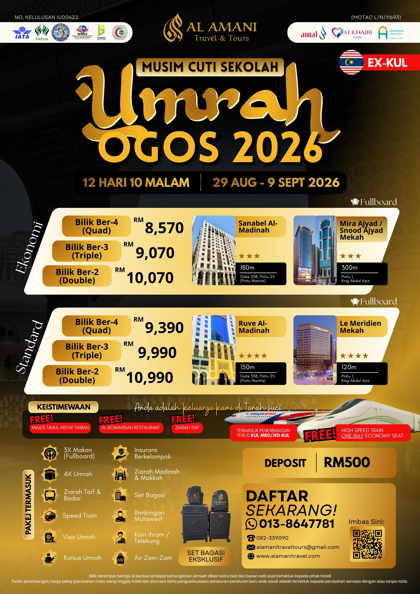 Isi musim cuti sekolah Ogos 2026 dengan perjalanan ibadah yang penuh makna bersama insan tersayang. Pakej Umrah Ogos oleh Al Amani Travel & Tours direka khas untuk memudahkan ibu bapa membawa anak-anak merasai pengalaman berharga di Tanah Suci tanpa mengganggu sesi persekolahan.