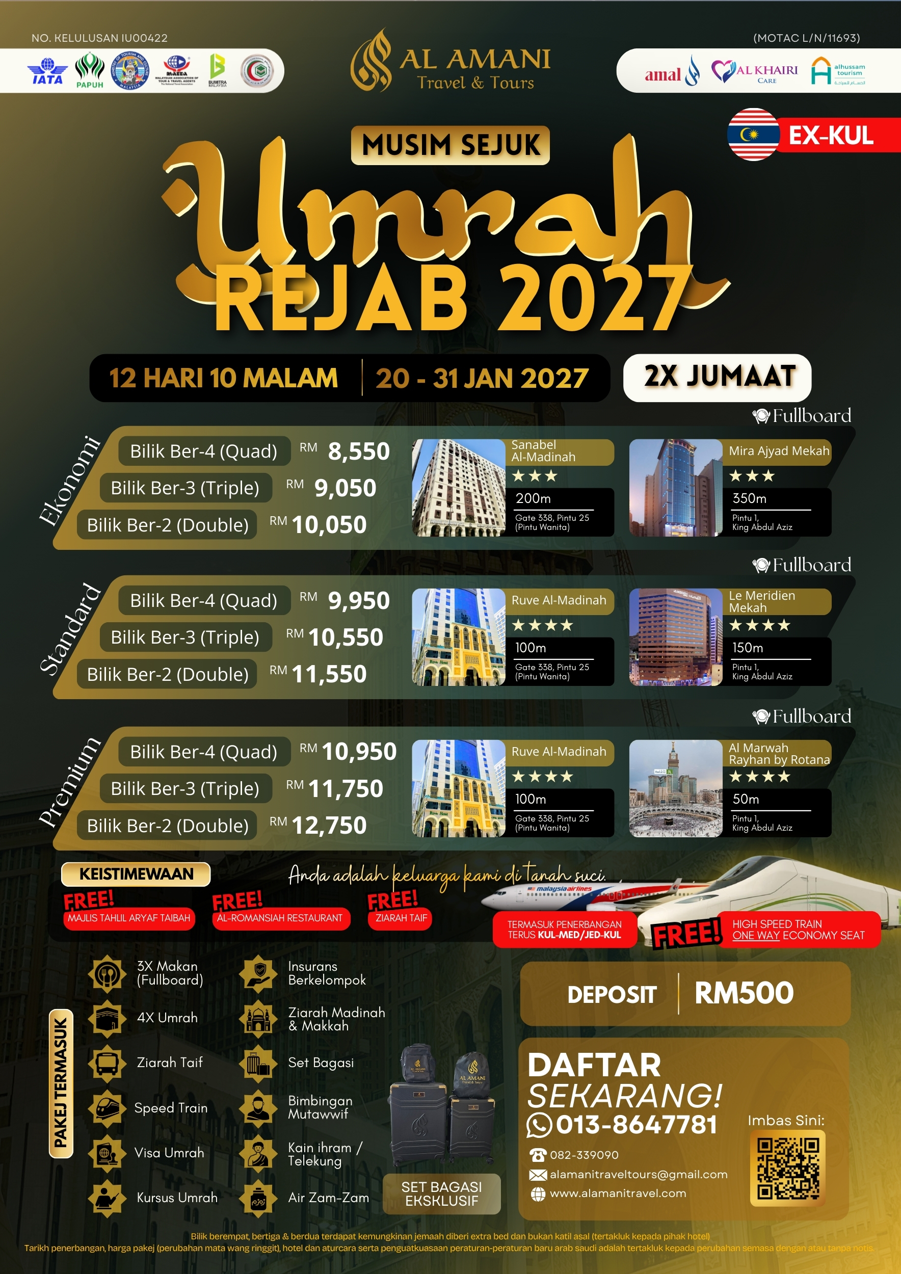 Raih keberkatan luar biasa dengan menunaikan Umrah pada bulan Rejab Januari 2027 dalam suasana musim sejuk yang nyaman, lengkap dengan 2 kali Jumaat di Tanah Suci. Bersama Al Amani Travel & Tours, nikmati ibadah yang lebih khusyuk dan teratur di Masjidil Haram dan Masjid Nabawi.