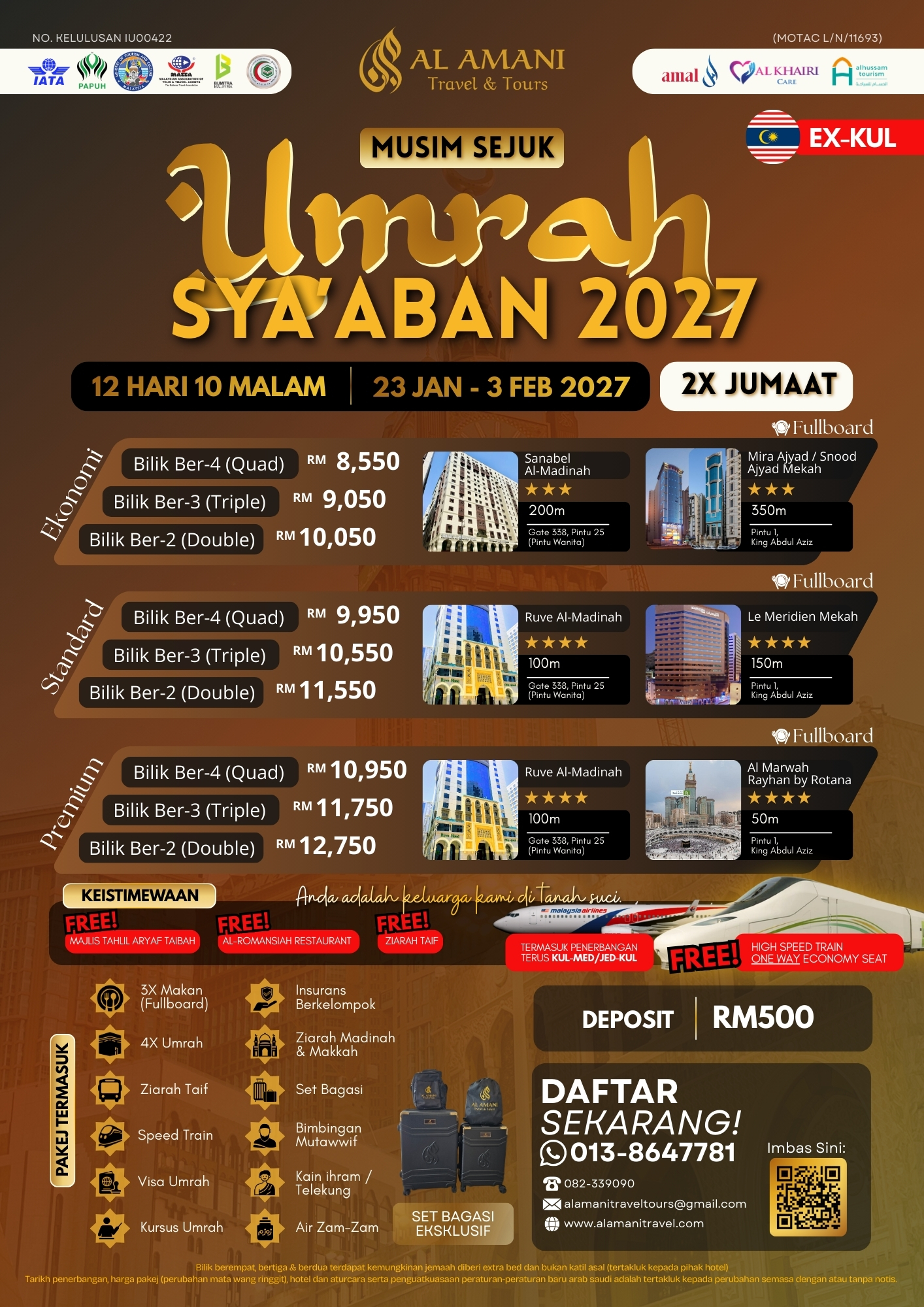 Pakej merangkumi penerbangan bersama Malaysia Airlines, hotel berhampiran masjid, hidangan lengkap dan 4 kali Umrah berbimbing mutawwif.