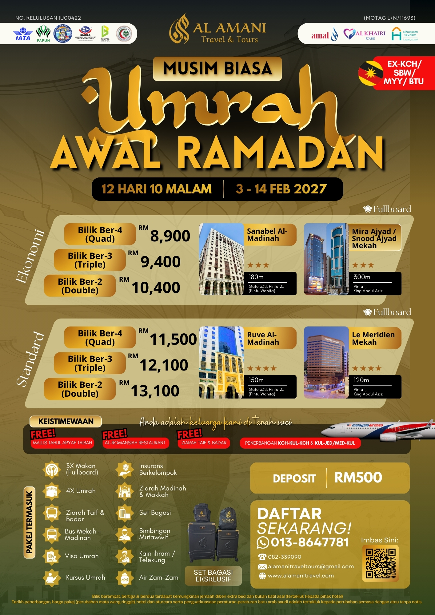 Raih kemuliaan beribadah pada fasa awal Ramadan dengan perjalanan yang lebih tenang dan tersusun bersama Al Amani Travel & Tours. Pakej ini tidak termasuk tren laju, sebaliknya memberi peluang istimewa untuk menyertai ziarah ke Badar, lokasi bersejarah berlakunya Perang Badar yang penuh pengajaran dan ibrah.
