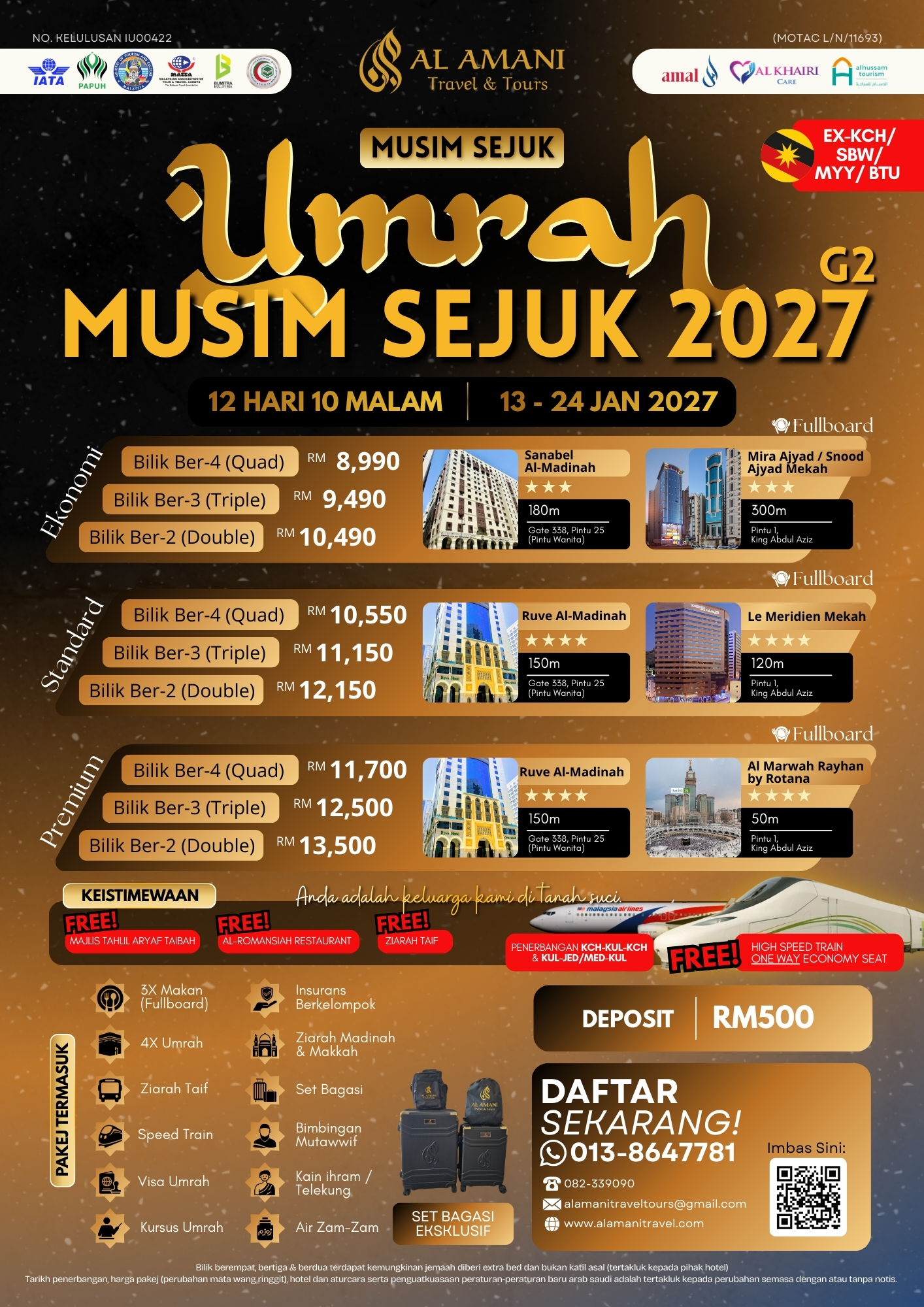 Teruskan keberkatan awal tahun dengan Umrah Musim Sejuk G2 Januari 2027 bersama Al Amani Travel & Tours. Pakej ini menggunakan laluan KUL–JED / MED–KUL, memberi pengalaman memulakan perjalanan di Makkah sebelum menutupnya dengan ketenangan di Madinah.