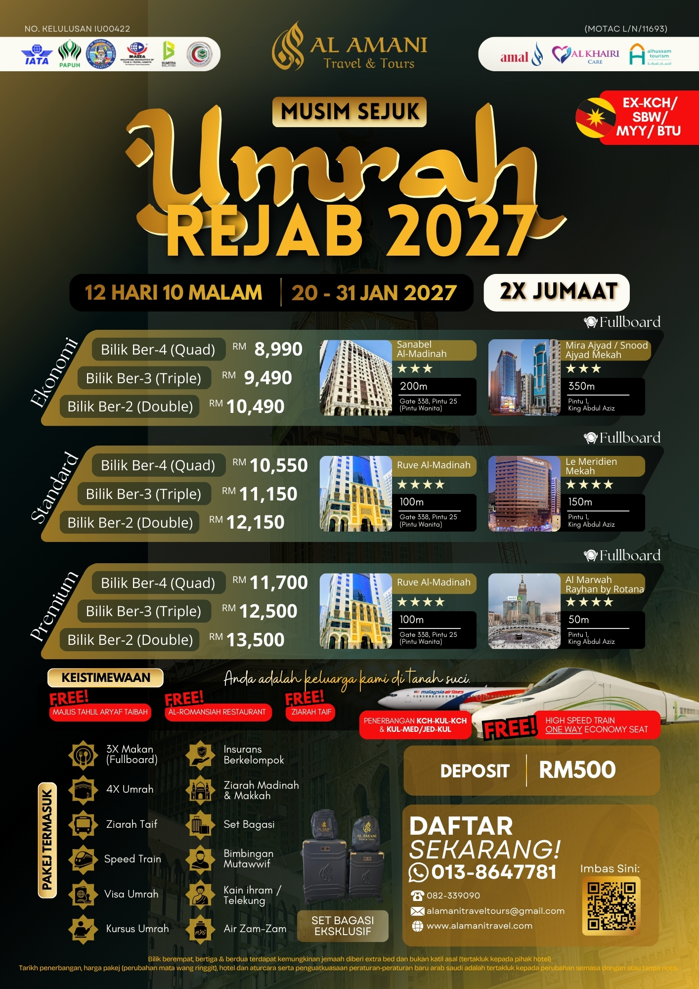 Raih keberkatan luar biasa dengan menunaikan Umrah pada bulan Rejab Januari 2027 dalam suasana musim sejuk yang nyaman, lengkap dengan 2 kali Jumaat di Tanah Suci. Bersama Al Amani Travel & Tours, nikmati ibadah yang lebih khusyuk dan teratur di Masjidil Haram dan Masjid Nabawi.